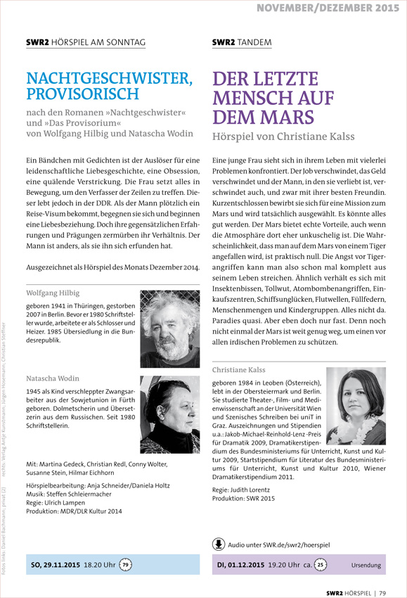Das Hörspiel "Nachtgeschwister, provosorisch" verknüpft die Romane "Nachtgeschwister" von Natascha Wodin und "Das Provisorium" von Wolfgang Hilbig. Es beschreibt das obsessive Zusammenleben eines Ost-West-Schriftstellerpaars ab Mitte der 1980er-Jahre im zunächst geteilten, dann vereinigten Deutschland. Gesendet wird das Hörspiel im November 2015 auf den Kulturkanälen des Bayerischen und des Südwestdeutschen Rundfunks.