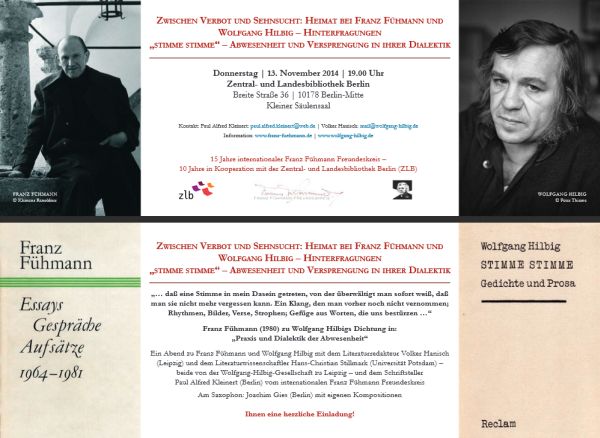 In Franz Fühmann, dessen Todestag sich 2014 zum 30. Mal jährte, hatte Wolfgang Hilbig einen entschlossenen Förderer. Für beide ist "Heimat" eine mythische Kategorie, verknüpft mit Motiven der Romantik. Über die "Heimaten" beider, so auch die Stadt Meuselwitz, kommen an diesem Abend Paul-Alfred Kleinert (Franz Fühmann Freundeskreis), Dr. Hans-Christian Stillmark und Volker Hanisch (beide Wolfgang-Hilbig-Gesellschaft) ins Gespräch. Am Saxophon untermalt die Veranstaltung Joachim Gies mit eigenen Kompositionen.