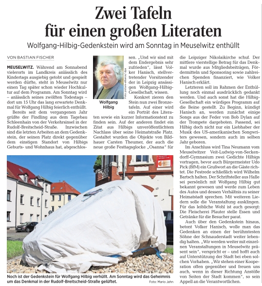 Die Osterländer Volkszeitung meldete am 14.2. den Beginn des Projekts und berichtete vor und nach der Enthüllung des Gedenksteins in Wolfgang Hilbigs Heimatstadt Meuselwitz.