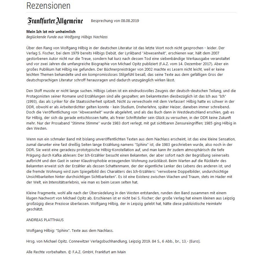 Am 8.8. 2019 besprach die FAZ den von der Wolfgang-Hilbig-Gesellschaft initiierten, herausgegebenen (Michael Opitz) und verlegten (Peter Hinke) Nachlassband. (Quelle: bücher.de)