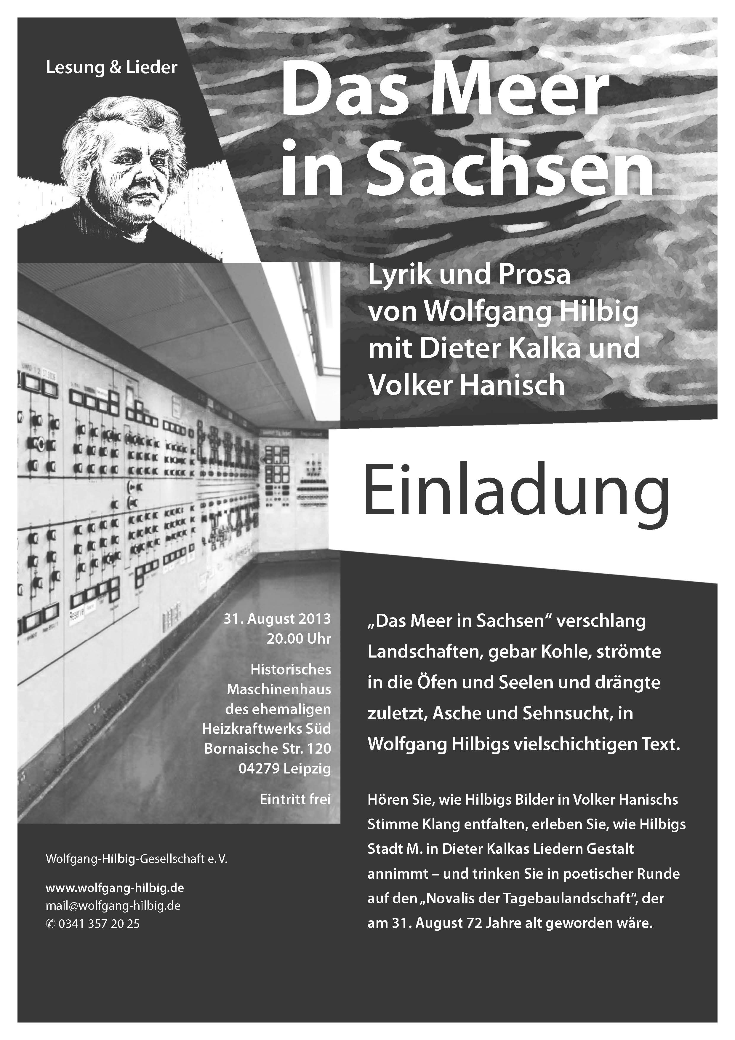 "Das Meer in Sachsen", ein von der Wolfgang-Hilbig-Gesellschaft gefördertes Bühnenprogramm, hatte Premiere am 31. August 2013 zum Leipziger "Tag der Industriekultur". Dieter Kalka und Volker Hanisch interpretieren "Industrietexte" Hilbigs wie "Die verlassene Fabrik", "Der Durst", "windmühlen wassermühlen", die sich in gefühlvollen musikalischen Zwischenstücken Dieter Kalkas wie "Der Mann aus Stein" oder "Mühlenlied" widerspiegeln. - Hier ist das Programm nachzuhören (die ersten fünf Minuten O-Ton Wolfgang Hilbig aus dem "Off" lassen sich überspringen).