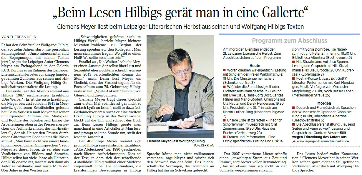 Am 30.30.2017 berichtete die Leipziger Volkszeitung über den Auftritt des Schriftstellers Clemens Meyer beim Leipziger Literaturfestival.